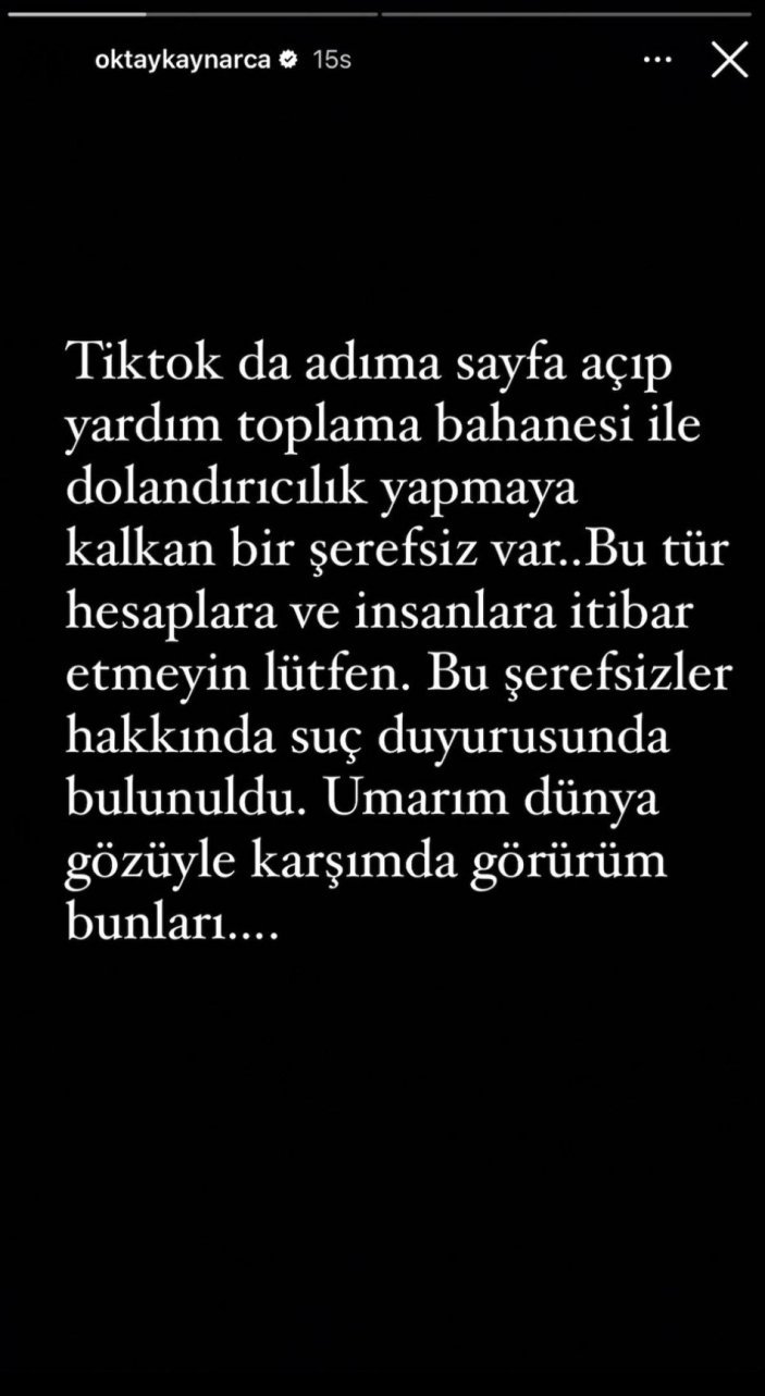 “TikTok’ta adıma sayfa açıp yardım toplama mazeretiyle dolandırıcılık yapmaya kalkan bir gurursuz var. Bu cins hesaplara ve insanlara prestij etmeyin lütfen. Bu erdemsizler hakkında hata duyurusunda bulunuldu. Umarım dünya gözüyle karşımda görürüm bunları”